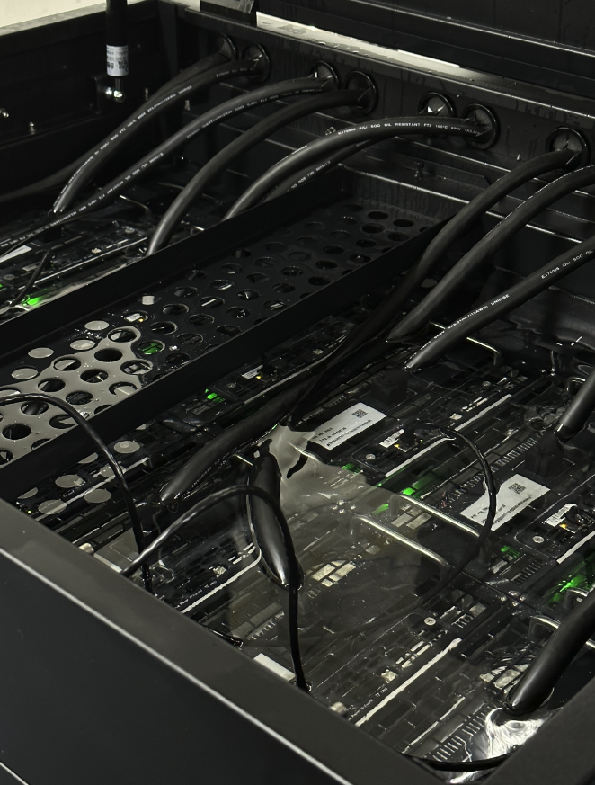 Moving onto the immersion setup - the immersion cooling system was equipped with the Whatsminer M56 model class, which was released January this year as MicroBT’s first immersion-specific model. These machines have a hashrate range of 168 to 194 TH/s with an efficiency of 29 J/T. Running in the recommended Shell S5X/S3X coolant with a ≥24L/min SLM, they run with remarkable quietness and sleek efficiency inside the immersion tanks.