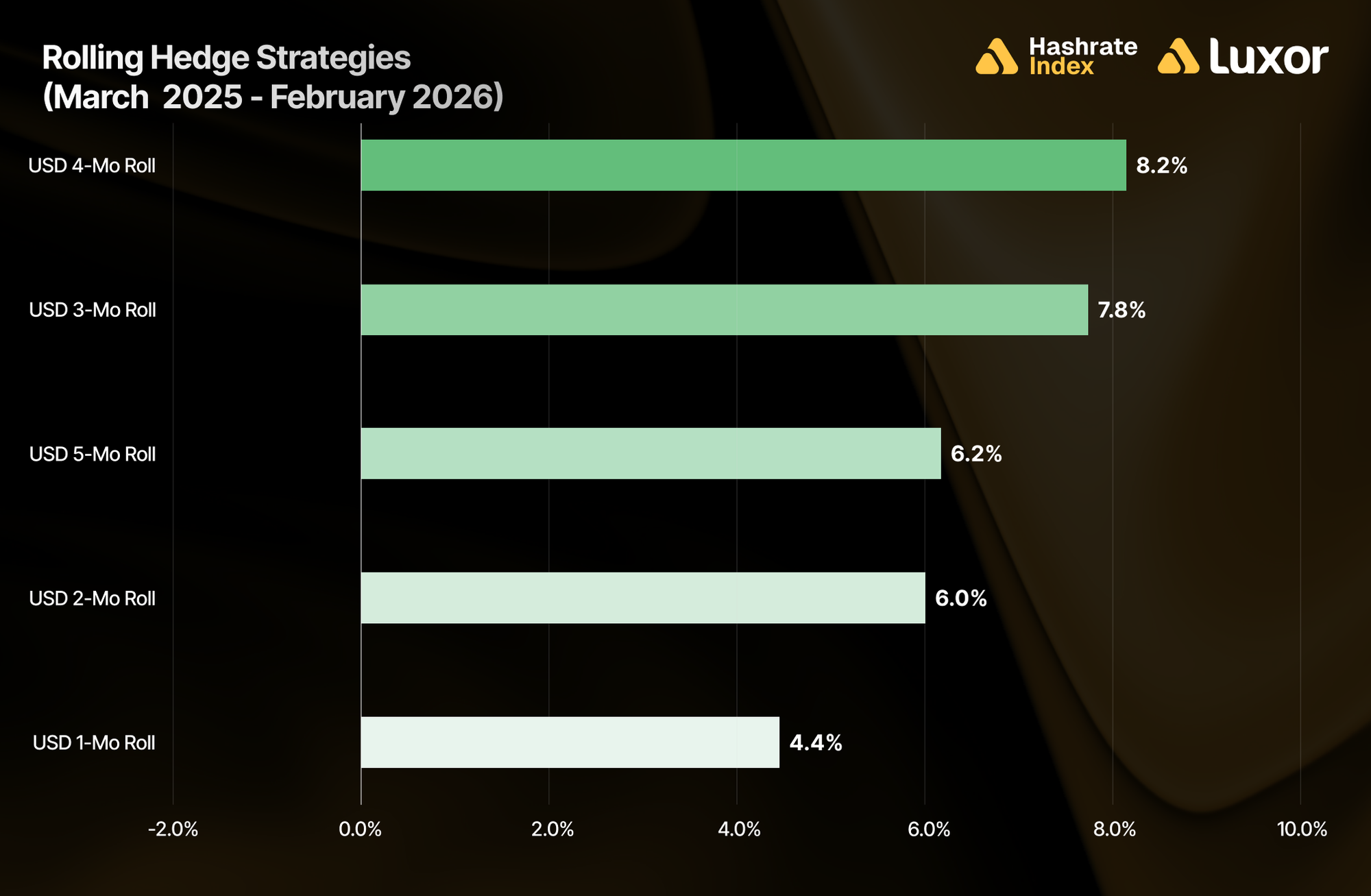 - Over the trailing twelve months, rolling USD-denominated hashprice hedging has outperformed spot (FPPS) mining by up to +8.2%.