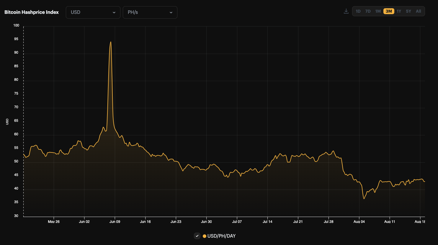 Hashprice also trended flat throughout the week, increasing by ~4.32% from $41.70/PH/Day to $43.50/PH/Day, at the time of writing. A mild improvement in week-to-week profitability, however mining economics remain compressed when zooming out to a wider timeframe. Hashprice has decreased by ~19% over the past three months, demonstrating the stress-test placed on miners through the halving event.